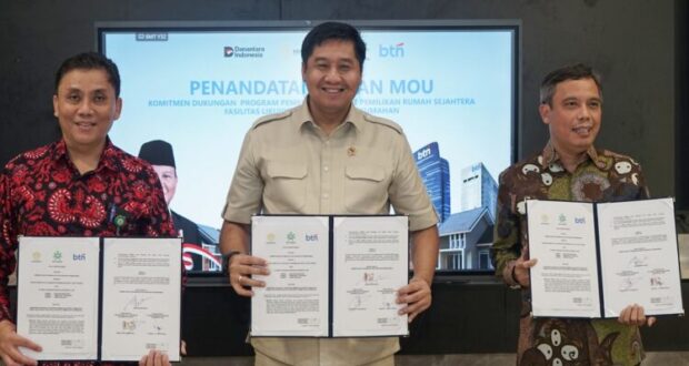 JAKARTA – Menteri Perumahan dan Kawasan Permukiman (PKP) Maruarar Sirait menandatangani formulir pembukaan rekening tabungan di BTN disaksikan Direktur Utama BTN Nixon LP Napitupulu usai Penandatanganan Perjanjian MOU Komitmen Dukungan Program Pembiayaan KPR Sejahtera FLPP di Jakarta, Rabu (18/6).